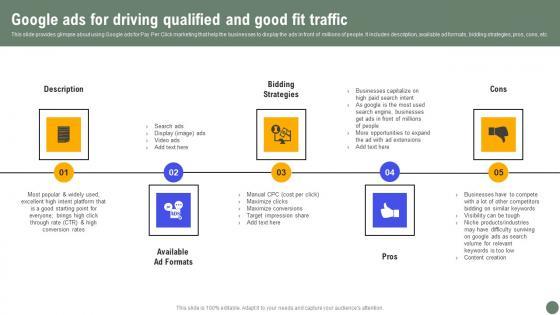 This slide provides glimpse about using Google ads for Pay Per Click marketing that help the businesses to display the ads in front of millions of people. It includes description, available ad formats, bidding strategies, pros, cons, etc. Are you in need of a template that can accommodate all of your creative concepts This one is crafted professionally and can be altered to fit any style. Use it with Google Slides or PowerPoint. Include striking photographs, symbols, depictions, and other visuals. Fill, move around, or remove text boxes as desired. Test out color palettes and font mixtures. Edit and save your work, or work with colleagues. Download Google Ads For Driving Qualified Exhaustive Guide Of Pay Per Click Advertising Initiative Ideas Pdf and observe how to make your presentation outstanding. Give an impeccable presentation to your group and make your presentation unforgettable. This slide provides glimpse about using Google ads for Pay Per Click marketing that help the businesses to display the ads in front of millions of people. It includes description, available ad formats, bidding strategies, pros, cons, etc.