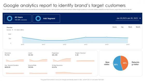 This slide shows the report to help enterprise identify and analyze the behavior, demographics and online behavior of their target audience. It includes details related to number of users, page views, bounce rate etc.Slidegeeks is one of the best resources for PowerPoint templates. You can download easily and regulate Google Analytics Report To Identify Brands Guide For Data Driven Advertising Infographics Pdf for your personal presentations from our wonderful collection. A few clicks is all it takes to discover and get the most relevant and appropriate templates. Use our Templates to add a unique zing and appeal to your presentation and meetings. All the slides are easy to edit and you can use them even for advertisement purposes. This slide shows the report to help enterprise identify and analyze the behavior, demographics and online behavior of their target audience. It includes details related to number of users, page views, bounce rate etc.
