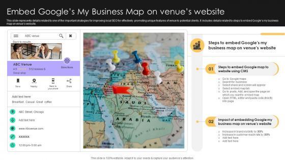 This slide represents details related to one of the important strategies for improving local SEO for effectively promoting unique features of venue to potential clients. It includes details related to steps to embed Googles my business map on venues website. Get a simple yet stunning designed Online Venue Advertising Plan Embed Googles My Business Map On Venues Website Strategy SS V. It is the best one to establish the tone in your meetings. It is an excellent way to make your presentations highly effective. So, download this PPT today from Slidegeeks and see the positive impacts. Our easy-to-edit Online Venue Advertising Plan Embed Googles My Business Map On Venues Website Strategy SS V can be your go-to option for all upcoming conferences and meetings. So, what are you waiting for Grab this template today. This slide represents details related to one of the important strategies for improving local SEO for effectively promoting unique features of venue to potential clients. It includes details related to steps to embed Googles my business map on venues website.