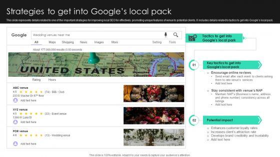 This slide represents details related to one of the important strategies for improving local SEO for effectively promoting unique features of venue to potential clients. It includes details related to tactics to get into Googles local pack. Presenting this PowerPoint presentation, titled Online Venue Advertising Plan Strategies To Get Into Googles Local Pack Strategy SS V, with topics curated by our researchers after extensive research. This editable presentation is available for immediate download and provides attractive features when used. Download now and captivate your audience. Presenting this Online Venue Advertising Plan Strategies To Get Into Googles Local Pack Strategy SS V. Our researchers have carefully researched and created these slides with all aspects taken into consideration. This is a completely customizable Online Venue Advertising Plan Strategies To Get Into Googles Local Pack Strategy SS V that is available for immediate downloading. Download now and make an impact on your audience. Highlight the attractive features available with our PPTs. This slide represents details related to one of the important strategies for improving local SEO for effectively promoting unique features of venue to potential clients. It includes details related to tactics to get into Googles local pack.