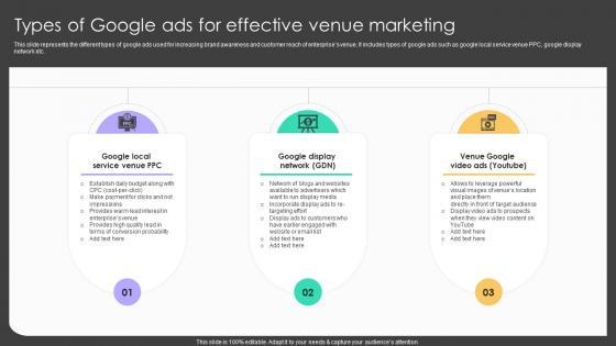 This slide represents the different types of google ads used for increasing brand awareness and customer reach of enterprises venue. It includes types of google ads such as google local service venue PPC, google display network etc. Want to ace your presentation in front of a live audience Our Online Venue Advertising Plan Types Of Google Ads For Effective Venue Marketing Strategy SS V can help you do that by engaging all the users towards you. Slidegeeks experts have put their efforts and expertise into creating these impeccable powerpoint presentations so that you can communicate your ideas clearly. Moreover, all the templates are customizable, and easy-to-edit and downloadable. Use these for both personal and commercial use. This slide represents the different types of google ads used for increasing brand awareness and customer reach of enterprises venue. It includes types of google ads such as google local service venue PPC, google display network etc.