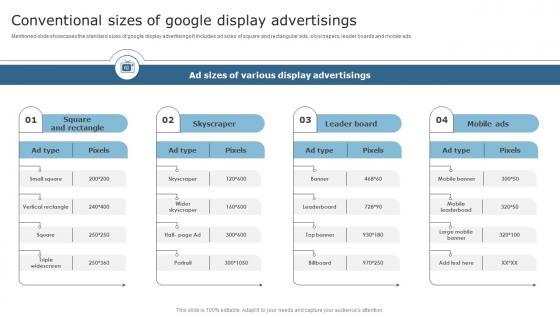 Mentioned slide showcases the standard sizes of google display advertisings It includes ad sizes of square and rectangular ads, skyscrapers, leader boards and mobile ads. Get a simple yet stunning designed Conventional Sizes Of Google Display Advertisings Ppt Show Slide Download PDF. It is the best one to establish the tone in your meetings. It is an excellent way to make your presentations highly effective. So, download this PPT today from Slidegeeks and see the positive impacts. Our easy to edit Conventional Sizes Of Google Display Advertisings Ppt Show Slide Download PDF can be your go to option for all upcoming conferences and meetings. So, what are you waiting for Grab this template today.