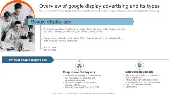 This slide covers the brief overview of google display advertising and it classification. It incorporates responsive display ads and uploaded image ads and their functioning. Create an editable Overview Of Google Display Advertising And Its Types Ideas PDF that communicates your idea and engages your audience. Whether youre presenting a business or an educational presentation, pre designed presentation templates help save time. Overview Of Google Display Advertising And Its Types Ideas PDF is highly customizable and very easy to edit, covering many different styles from creative to business presentations. Slidegeeks has creative team members who have crafted amazing templates. So, go and get them without any delay.