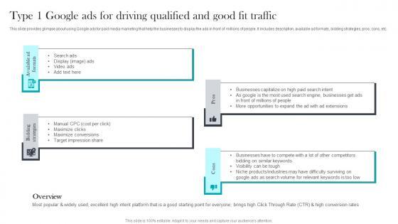 This slide provides glimpse about using Google ads for paid media marketing that help the businesses to display the ads in front of millions of people. It includes description, available ad formats, bidding strategies, pros, cons, etc. Presenting this PowerPoint presentation, titled Type 1 Google Ads For Driving Paid Media Advertising For Optimizing Customer Pictures Pdf, with topics curated by our researchers after extensive research. This editable presentation is available for immediate download and provides attractive features when used. Download now and captivate your audience. Presenting this Type 1 Google Ads For Driving Paid Media Advertising For Optimizing Customer Pictures Pdf. Our researchers have carefully researched and created these slides with all aspects taken into consideration. This is a completely customizable Type 1 Google Ads For Driving Paid Media Advertising For Optimizing Customer Pictures Pdf that is available for immediate downloading. Download now and make an impact on your audience. Highlight the attractive features available with our PPTs. This slide provides glimpse about using Google ads for paid media marketing that help the businesses to display the ads in front of millions of people. It includes description, available ad formats, bidding strategies, pros, cons, etc.