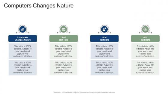 Introducing our well designed Computers Changes Nature In Powerpoint And Google Slides Cpb. This PowerPoint design presents information on topics like Computers Changes Nature. As it is predesigned it helps boost your confidence level. It also makes you a better presenter because of its high quality content and graphics. This PPT layout can be downloaded and used in different formats like PDF, PNG, and JPG. Not only this, it is available in both Standard Screen and Widescreen aspect ratios for your convenience. Therefore, click on the download button now to persuade and impress your audience. Our Computers Changes Nature In Powerpoint And Google Slides Cpb are topically designed to provide an attractive backdrop to any subject. Use them to look like a presentation pro.