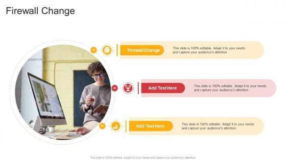 Presenting our innovatively-designed set of slides titled Firewall Change In Powerpoint And Google Slides Cpb. This completely editable PowerPoint graphic exhibits Firewall Change that will help you convey the message impactfully. It can be accessed with Google Slides and is available in both standard screen and widescreen aspect ratios. Apart from this, you can download this well-structured PowerPoint template design in different formats like PDF, JPG, and PNG. So, click the download button now to gain full access to this PPT design. Our Firewall Change In Powerpoint And Google Slides Cpb are topically designed to provide an attractive backdrop to any subject. Use them to look like a presentation pro.
