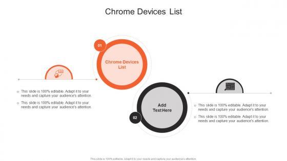 Introducing our well-designed Chrome Devices List In Powerpoint And Google Slides Cpb. This PowerPoint design presents information on topics like Chrome Devices List. As it is predesigned it helps boost your confidence level. It also makes you a better presenter because of its high-quality content and graphics. This PPT layout can be downloaded and used in different formats like PDF, PNG, and JPG. Not only this, it is available in both Standard Screen and Widescreen aspect ratios for your convenience. Therefore, click on the download button now to persuade and impress your audience. Our Chrome Devices List In Powerpoint And Google Slides Cpb are topically designed to provide an attractive backdrop to any subject. Use them to look like a presentation pro.