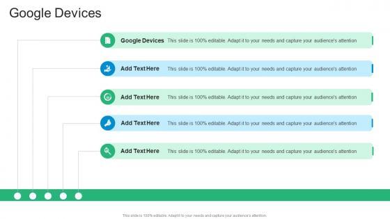 Introducing our well-designed Google Devices In Powerpoint And Google Slides Cpb. This PowerPoint design presents information on topics like Google Devices. As it is predesigned it helps boost your confidence level. It also makes you a better presenter because of its high-quality content and graphics. This PPT layout can be downloaded and used in different formats like PDF, PNG, and JPG. Not only this, it is available in both Standard Screen and Widescreen aspect ratios for your convenience. Therefore, click on the download button now to persuade and impress your audience. Our Google Devices In Powerpoint And Google Slides Cpb are topically designed to provide an attractive backdrop to any subject. Use them to look like a presentation pro.