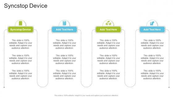 Presenting our innovatively designed set of slides titled Syncstop Device In Powerpoint And Google Slides Cpb. This completely editable PowerPoint graphic exhibits Syncstop Device that will help you convey the message impactfully. It can be accessed with Google Slides and is available in both standard screen and widescreen aspect ratios. Apart from this, you can download this well structured PowerPoint template design in different formats like PDF, JPG, and PNG. So, click the download button now to gain full access to this PPT design. Our Syncstop Device In Powerpoint And Google Slides Cpb are topically designed to provide an attractive backdrop to any subject. Use them to look like a presentation pro.