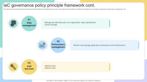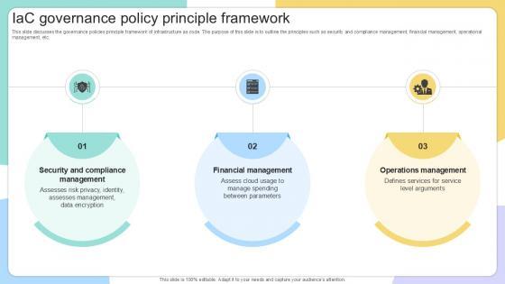 This slide discusses the governance policies principle framework of infrastructure as code. The purpose of this slide is to outline the principles such as security and compliance management, financial management, operational management, etc. Are you searching for a IAC Governance Policy Principle IAC Tools For Performance Analysis PPT Sample that is uncluttered, straightforward, and original Its easy to edit, and you can change the colors to suit your personal or business branding. For a presentation that expresses how much effort you have put in, this template is ideal With all of its features, including tables, diagrams, statistics, and lists, its perfect for a business plan presentation. Make your ideas more appealing with these professional slides. Download IAC Governance Policy Principle IAC Tools For Performance Analysis PPT Sample from Slidegeeks today. This slide discusses the governance policies principle framework of infrastructure as code. The purpose of this slide is to outline the principles such as security and compliance management, financial management, operational management, etc.
