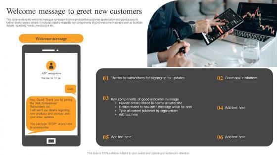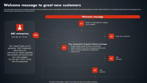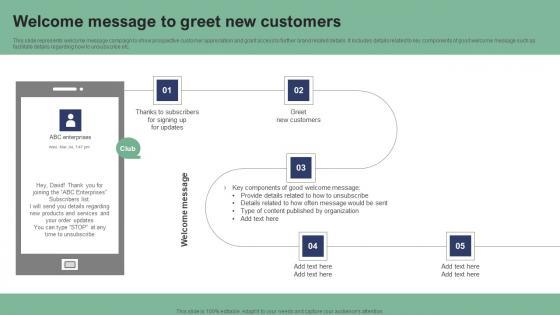 This slide represents welcome message campaign to show prospective customer appreciation and grant access to further brand related details. It includes details related to key components of good welcome message such as facilitate details regarding how to unsubscribe etc. Are you in need of a template that can accommodate all of your creative concepts This one is crafted professionally and can be altered to fit any style. Use it with Google Slides or PowerPoint. Include striking photographs, symbols, depictions, and other visuals. Fill, move around, or remove text boxes as desired. Test out color palettes and font mixtures. Edit and save your work, or work with colleagues. Download Welcome Message To Greet New Customers SMS Promotional Tactics Template PDF and observe how to make your presentation outstanding. Give an impeccable presentation to your group and make your presentation unforgettable. This slide represents welcome message campaign to show prospective customer appreciation and grant access to further brand related details. It includes details related to key components of good welcome message such as facilitate details regarding how to unsubscribe etc.