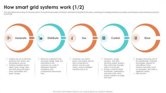 This slide outlines the working of smart grid systems. It includes the generation of electricity, distribution of electricity to the public, controlling and managing electricity consumption and storing the surplus electricity produced by households. Crafting an eye catching presentation has never been more straightforward. Let your presentation shine with this tasteful yet straightforward Smart Grid Technology How Smart Grid Systems Work Slides PDF template. It offers a minimalistic and classy look that is great for making a statement. The colors have been employed intelligently to add a bit of playfulness while still remaining professional. Construct the ideal Smart Grid Technology How Smart Grid Systems Work Slides PDF that effortlessly grabs the attention of your audience. Begin now and be certain to wow your customers.