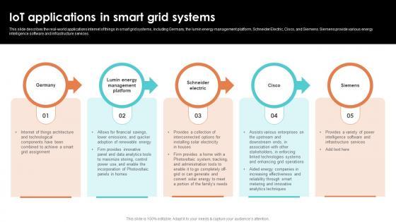 This slide describes the real world applications internet of things in smart grid systems, including Germany, the lumin energy management platform, Schneider Electric, Cisco, and Siemens. Siemens provide various energy intelligence software and infrastructure services. Formulating a presentation can take up a lot of effort and time, so the content and message should always be the primary focus. The visuals of the PowerPoint can enhance the presenters message, so our IoT Applications In Smart Grid Systems Smart Grid Working was created to help save time. Instead of worrying about the design, the presenter can concentrate on the message while our designers work on creating the ideal templates for whatever situation is needed. Slidegeeks has experts for everything from amazing designs to valuable content, we have put everything into IoT Applications In Smart Grid Systems Smart Grid Working This slide describes the real world applications internet of things in smart grid systems, including Germany, the lumin energy management platform, Schneider Electric, Cisco, and Siemens. Siemens provide various energy intelligence software and infrastructure services.