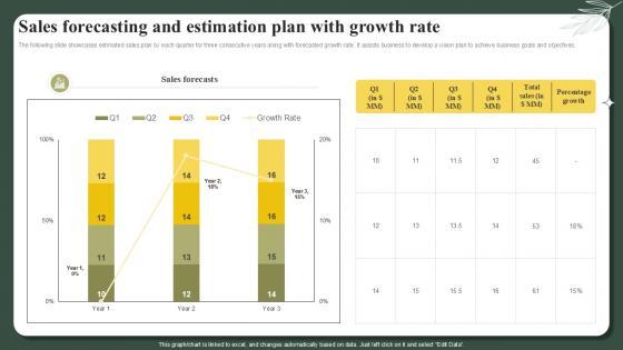 The following slide showcases estimated sales plan by each quarter for three consecutive years along with forecasted growth rate. It assists business to develop a vision plan to achieve business goals and objectives. Formulating a presentation can take up a lot of effort and time, so the content and message should always be the primary focus. The visuals of the PowerPoint can enhance the presenters message, so our Sales Forecasting And Estimation Plan With Growth Rate Successful Launch Ppt Powerpoint was created to help save time. Instead of worrying about the design, the presenter can concentrate on the message while our designers work on creating the ideal templates for whatever situation is needed. Slidegeeks has experts for everything from amazing designs to valuable content, we have put everything into Sales Forecasting And Estimation Plan With Growth Rate Successful Launch Ppt Powerpoint The following slide showcases estimated sales plan by each quarter for three consecutive years along with forecasted growth rate. It assists business to develop a vision plan to achieve business goals and objectives.