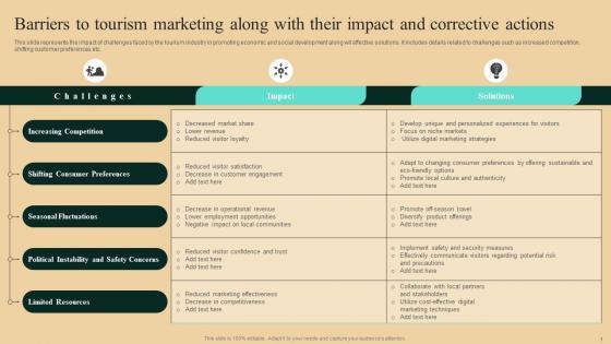 This slide represents the impact of challenges faced by the tourism industry in promoting economic and social development along wit effective solutions. It includes details related to challenges such as increased competition, shifting customer preferences etc. Boost your pitch with our creative Agenda Guide To Winning Tourism Marketing Strategies For Customer Attraction Summary Pdf Deliver an awe-inspiring pitch that will mesmerize everyone. Using these presentation templates you will surely catch everyones attention. You can browse the ppts collection on our website. We have researchers who are experts at creating the right content for the templates. So you do not have to invest time in any additional work. Just grab the template now and use them. This slide represents the impact of challenges faced by the tourism industry in promoting economic and social development along wit effective solutions. It includes details related to challenges such as increased competition, shifting customer preferences etc.