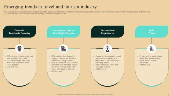 This slide represents the details related to latest trends in the industry which facilitates entertainment to tourists and contributes towards social and economic development. It includes details related to trends in tourism industry such as domestic tourism is booming, personalized experiences etc. Crafting an eye-catching presentation has never been more straightforward. Let your presentation shine with this tasteful yet straightforward Guide To Winning Tourism Emerging Trends In Travel And Tourism Industry Brochure Pdf template. It offers a minimalistic and classy look that is great for making a statement. The colors have been employed intelligently to add a bit of playfulness while still remaining professional. Construct the ideal Guide To Winning Tourism Emerging Trends In Travel And Tourism Industry Brochure Pdf that effortlessly grabs the attention of your audience Begin now and be certain to wow your customers This slide represents the details related to latest trends in the industry which facilitates entertainment to tourists and contributes towards social and economic development. It includes details related to trends in tourism industry such as domestic tourism is booming, personalized experiences etc.
