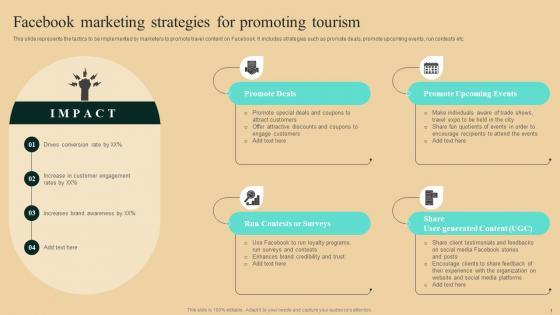This slide represents the tactics to be implemented by marketers to promote travel content on Facebook. It includes strategies such as promote deals, promote upcoming events, run contests etc. Coming up with a presentation necessitates that the majority of the effort goes into the content and the message you intend to convey. The visuals of a PowerPoint presentation can only be effective if it supplements and supports the story that is being told. Keeping this in mind our experts created Guide To Winning Tourism Facebook Marketing Strategies For Promoting Tourism Diagrams Pdf to reduce the time that goes into designing the presentation. This way, you can concentrate on the message while our designers take care of providing you with the right template for the situation. This slide represents the tactics to be implemented by marketers to promote travel content on Facebook. It includes strategies such as promote deals, promote upcoming events, run contests etc.