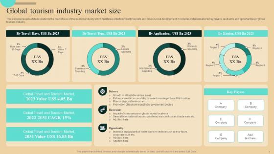 This slide represents details related to the market size of the tourism industry which facilitates entertainment to tourists and drives social development. It includes details related to key drivers, restraints and opportunities of global tourism industry. This modern and well-arranged Guide To Winning Tourism Global Tourism Industry Market Size Guidelines Pdf provides lots of creative possibilities. It is very simple to customize and edit with the Powerpoint Software. Just drag and drop your pictures into the shapes. All facets of this template can be edited with Powerpoint, no extra software is necessary. Add your own material, put your images in the places assigned for them, adjust the colors, and then you can show your slides to the world, with an animated slide included. This slide represents details related to the market size of the tourism industry which facilitates entertainment to tourists and drives social development. It includes details related to key drivers, restraints and opportunities of global tourism industry.