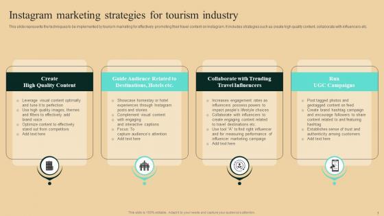 This slide represents the techniques to be implemented by tourism marketing for effectively promoting their travel content on Instagram. It includes strategies such as create high quality content, collaborate with influencers etc. Are you searching for a Guide To Winning Tourism Informational Emails For Increasing Customer Engagement Infographics Pdf that is uncluttered, straightforward, and original Its easy to edit, and you can change the colors to suit your personal or business branding. For a presentation that expresses how much effort you have put in, this template is ideal With all of its features, including tables, diagrams, statistics, and lists, its perfect for a business plan presentation. Make your ideas more appealing with these professional slides. Download Guide To Winning Tourism Informational Emails For Increasing Customer Engagement Infographics Pdf from Slidegeeks today. This slide represents the techniques to be implemented by tourism marketing for effectively promoting their travel content on Instagram. It includes strategies such as create high quality content, collaborate with influencers etc.
