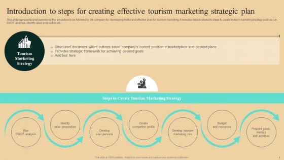 This slide represents brief overview of the procedure to be followed by the company for developing fruitful and effective plan for tourism marketing. It includes details related to steps to create tourism marketing strategy such as run SWOT analysis, identify value proposition etc. Presenting this PowerPoint presentation, titled Guide To Winning Tourism Introduction To Steps For Creating Effective Tourism Marketing Guidelines Pdf with topics curated by our researchers after extensive research. This editable presentation is available for immediate download and provides attractive features when used. Download now and captivate your audience. Presenting this Guide To Winning Tourism Introduction To Steps For Creating Effective Tourism Marketing Guidelines Pdf Our researchers have carefully researched and created these slides with all aspects taken into consideration. This is a completely customizable Guide To Winning Tourism Introduction To Steps For Creating Effective Tourism Marketing Guidelines Pdf that is available for immediate downloading. Download now and make an impact on your audience. Highlight the attractive features available with our PPTs. This slide represents brief overview of the procedure to be followed by the company for developing fruitful and effective plan for tourism marketing. It includes details related to steps to create tourism marketing strategy such as run SWOT analysis, identify value proposition etc.