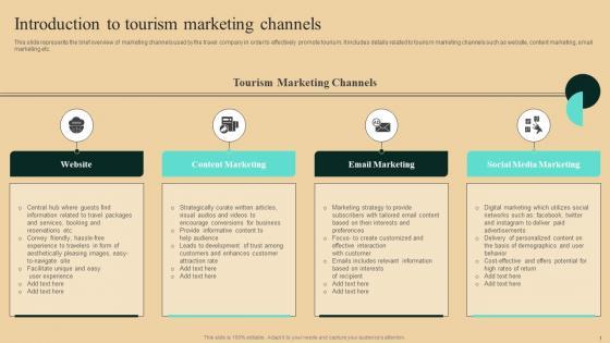 This slide represents the brief overview of marketing channels used by the travel company in order to effectively promote tourism. It includes details related to tourism marketing channels such as website, content marketing, email marketing etc. Here you can discover an assortment of the finest PowerPoint and Google Slides templates. With these templates, you can create presentations for a variety of purposes while simultaneously providing your audience with an eye-catching visual experience. Download Guide To Winning Tourism Introduction To Tourism Marketing Channels Information Pdf to deliver an impeccable presentation. These templates will make your job of preparing presentations much quicker, yet still, maintain a high level of quality. Slidegeeks has experienced researchers who prepare these templates and write high-quality content for you. Later on, you can personalize the content by editing the Guide To Winning Tourism Introduction To Tourism Marketing Channels Information Pdf This slide represents the brief overview of marketing channels used by the travel company in order to effectively promote tourism. It includes details related to tourism marketing channels such as website, content marketing, email marketing etc.