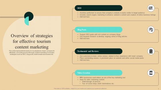This slide represents the tactics to be adopted by travel company for effectively promoting tourism through content marketing. It includes strategies such as SEO, blog posts, testimonials and reviews etc. Slidegeeks is here to make your presentations a breeze with Guide To Winning Tourism Overview Of Strategies For Effective Tourism Content Background Pdf With our easy-to-use and customizable templates, you can focus on delivering your ideas rather than worrying about formatting. With a variety of designs to choose from, you are sure to find one that suits your needs. And with animations and unique photos, illustrations, and fonts, you can make your presentation pop. So whether you are giving a sales pitch or presenting to the board, make sure to check out Slidegeeks first This slide represents the tactics to be adopted by travel company for effectively promoting tourism through content marketing. It includes strategies such as SEO, blog posts, testimonials and reviews etc.