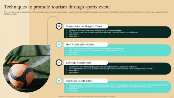 This slide represents strategies to promote travel for the sake of viewing or participating in sports events staying apart from usual environment. It includes strategies for promoting tourism through sports such as partner with local sports teams etc. Coming up with a presentation necessitates that the majority of the effort goes into the content and the message you intend to convey. The visuals of a PowerPoint presentation can only be effective if it supplements and supports the story that is being told. Keeping this in mind our experts created Guide To Winning Tourism Techniques To Promote Tourism Through Sports Event Elements Pdf to reduce the time that goes into designing the presentation. This way, you can concentrate on the message while our designers take care of providing you with the right template for the situation. This slide represents strategies to promote travel for the sake of viewing or participating in sports events staying apart from usual environment. It includes strategies for promoting tourism through sports such as partner with local sports teams etc.