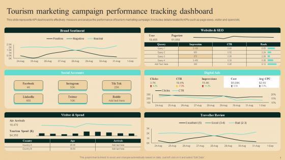 This slide represents KPI dashboard to effectively measure and analyze the performance of tourism marketing campaign. It includes details related to KPIs such as page views, visitor and spend etc. This modern and well-arranged Guide To Winning Tourism Tourism Marketing Campaign Performance Tracking Dashboard Download Pdf provides lots of creative possibilities. It is very simple to customize and edit with the Powerpoint Software. Just drag and drop your pictures into the shapes. All facets of this template can be edited with Powerpoint, no extra software is necessary. Add your own material, put your images in the places assigned for them, adjust the colors, and then you can show your slides to the world, with an animated slide included. This slide represents KPI dashboard to effectively measure and analyze the performance of tourism marketing campaign. It includes details related to KPIs such as page views, visitor and spend etc.