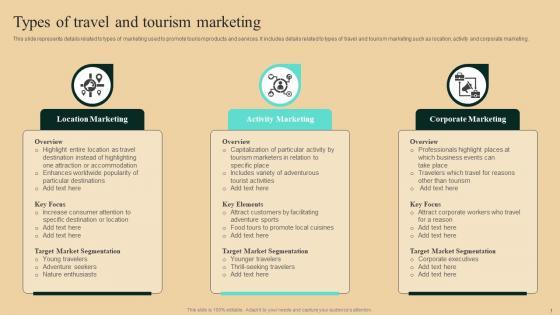 This slide represents details related to types of marketing used to promote tourism products and services. It includes details related to types of travel and tourism marketing such as location, activity and corporate marketing. Explore a selection of the finest Guide To Winning Tourism Types Of Travel And Tourism Marketing Template Pdf here. With a plethora of professionally designed and pre-made slide templates, you can quickly and easily find the right one for your upcoming presentation. You can use our Guide To Winning Tourism Types Of Travel And Tourism Marketing Template Pdf to effectively convey your message to a wider audience. Slidegeeks has done a lot of research before preparing these presentation templates. The content can be personalized and the slides are highly editable. Grab templates today from Slidegeeks. This slide represents details related to types of marketing used to promote tourism products and services. It includes details related to types of travel and tourism marketing such as location, activity and corporate marketing.