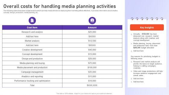 The following slide showcases budget analysis which can help media directors in deploying their marketing efforts effectively. It provides information about creative, concept, design, production, media planning, etc. Slidegeeks is here to make your presentations a breeze with Overall Costs For Handling Media Planning Activities Microsoft PDF With our easy to use and customizable templates, you can focus on delivering your ideas rather than worrying about formatting. With a variety of designs to choose from, you are sure to find one that suits your needs. And with animations and unique photos, illustrations, and fonts, you can make your presentation pop. So whether you are giving a sales pitch or presenting to the board, make sure to check out Slidegeeks first.