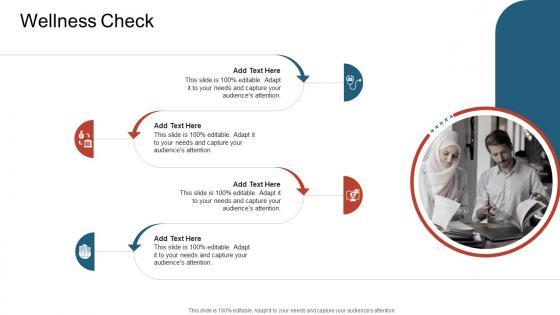 Introducing our well designed Wellness Check In Powerpoint And Google Slides Cpb. This PowerPoint design presents information on topics like Wellness Check. As it is predesigned it helps boost your confidence level. It also makes you a better presenter because of its high quality content and graphics. This PPT layout can be downloaded and used in different formats like PDF, PNG, and JPG. Not only this, it is available in both Standard Screen and Widescreen aspect ratios for your convenience. Therefore, click on the download button now to persuade and impress your audience. Our Wellness Check In Powerpoint And Google Slides Cpb are topically designed to provide an attractive backdrop to any subject. Use them to look like a presentation pro.