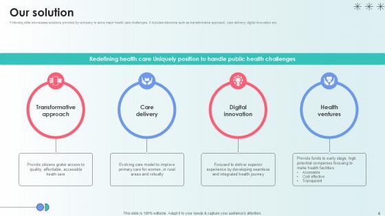Following slide showcases solutions provided by company to solve major health care challenges. It includes elements such as transformative approach, care delivery, digital innovation etc. Crafting an eye-catching presentation has never been more straightforward. Let your presentation shine with this tasteful yet straightforward Our Solution Capital Raising Pitch Deck For Health Care Services Ppt Example template. It offers a minimalistic and classy look that is great for making a statement. The colors have been employed intelligently to add a bit of playfulness while still remaining professional. Construct the ideal Our Solution Capital Raising Pitch Deck For Health Care Services Ppt Example that effortlessly grabs the attention of your audience Begin now and be certain to wow your customers Following slide showcases solutions provided by company to solve major health care challenges. It includes elements such as transformative approach, care delivery, digital innovation etc.