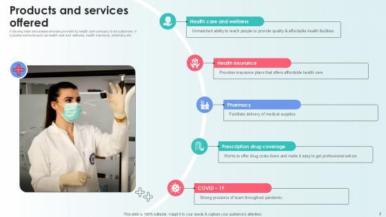 Following slide showcases services provided by health care company to its customers. It includes elements such as health care and wellness, health insurance, pharmacy etc. Formulating a presentation can take up a lot of effort and time, so the content and message should always be the primary focus. The visuals of the PowerPoint can enhance the presenters message, so our Products And Services Offered Capital Raising Pitch Deck For Health Care Services Ppt Example was created to help save time. Instead of worrying about the design, the presenter can concentrate on the message while our designers work on creating the ideal templates for whatever situation is needed. Slidegeeks has experts for everything from amazing designs to valuable content, we have put everything into Products And Services Offered Capital Raising Pitch Deck For Health Care Services Ppt Example Following slide showcases services provided by health care company to its customers. It includes elements such as health care and wellness, health insurance, pharmacy etc.
