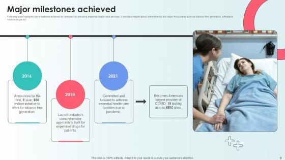 Following slide highlights key milestones achieved by company by providing essential health care services. It provides insights about commitments and major focus areas such as tobacco free generation, affordable medical drugs etc. If your project calls for a presentation, then Slidegeeks is your go-to partner because we have professionally designed, easy-to-edit templates that are perfect for any presentation. After downloading, you can easily edit Major Milestones Achieved Capital Raising Pitch Deck For Health Care Services Ppt Template and make the changes accordingly. You can rearrange slides or fill them with different images. Check out all the handy templates Following slide highlights key milestones achieved by company by providing essential health care services. It provides insights about commitments and major focus areas such as tobacco free generation, affordable medical drugs etc.