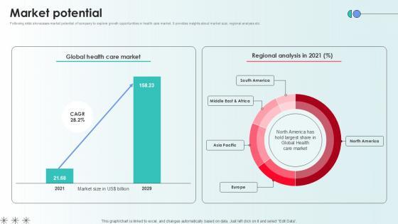 Following slide showcases market potential of company to explore growth opportunities in health care market. It provides insights about market size, regional analysis etc. If you are looking for a format to display your unique thoughts, then the professionally designed Market Potential Capital Raising Pitch Deck For Health Care Services Ppt Slide is the one for you. You can use it as a Google Slides template or a PowerPoint template. Incorporate impressive visuals, symbols, images, and other charts. Modify or reorganize the text boxes as you desire. Experiment with shade schemes and font pairings. Alter, share or cooperate with other people on your work. Download Market Potential Capital Raising Pitch Deck For Health Care Services Ppt Slide and find out how to give a successful presentation. Present a perfect display to your team and make your presentation unforgettable. Following slide showcases market potential of company to explore growth opportunities in health care market. It provides insights about market size, regional analysis etc.