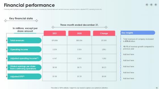 Following slide highlights company financial performance. It includes key financial data such as total revenues, operating income, adjusted EPS, operating income etc. From laying roadmaps to briefing everything in detail, our templates are perfect for you. You can set the stage with your presentation slides. All you have to do is download these easy-to-edit and customizable templates. Financial Performance Capital Raising Pitch Deck For Health Care Services Ppt Slide will help you deliver an outstanding performance that everyone would remember and praise you for. Do download this presentation today. Following slide highlights company financial performance. It includes key financial data such as total revenues, operating income, adjusted EPS, operating income etc.