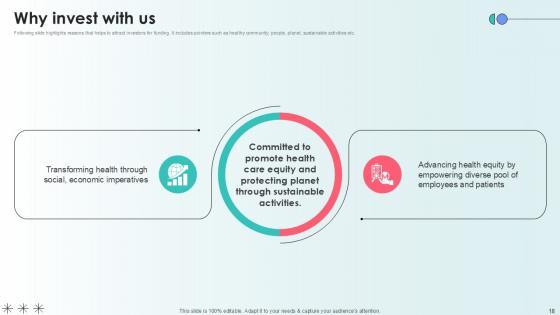 Following slide highlights reasons that helps to attract investors for funding. It includes pointers such as healthy community, people, planet, sustainable activities etc. The best PPT templates are a great way to save time, energy, and resources. Slidegeeks have 100 percent editable powerpoint slides making them incredibly versatile. With these quality presentation templates, you can create a captivating and memorable presentation by combining visually appealing slides and effectively communicating your message. Download Why Invest With Us Capital Raising Pitch Deck For Health Care Services Ppt Example from Slidegeeks and deliver a wonderful presentation. Following slide highlights reasons that helps to attract investors for funding. It includes pointers such as healthy community, people, planet, sustainable activities etc.