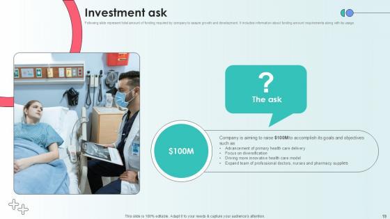 Following slide represent total amount of funding required by company to assure growth and development. It includes information about funding amount requirements along with its usage. Whether you have daily or monthly meetings, a brilliant presentation is necessary. Investment Ask Capital Raising Pitch Deck For Health Care Services Ppt Sample can be your best option for delivering a presentation. Represent everything in detail using Investment Ask Capital Raising Pitch Deck For Health Care Services Ppt Sample and make yourself stand out in meetings. The template is versatile and follows a structure that will cater to your requirements. All the templates prepared by Slidegeeks are easy to download and edit. Our research experts have taken care of the corporate themes as well. So, give it a try and see the results. Following slide represent total amount of funding required by company to assure growth and development. It includes information about funding amount requirements along with its usage.