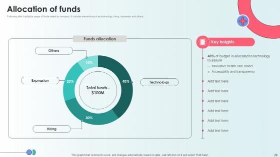 Following slide highlights usage of funds raised by company. It includes elements such as technology, hiring, expansion and others. Find a pre-designed and impeccable Allocation Of Funds Capital Raising Pitch Deck For Health Care Services Ppt Presentation. The templates can ace your presentation without additional effort. You can download these easy-to-edit presentation templates to make your presentation stand out from others. So, what are you waiting for Download the template from Slidegeeks today and give a unique touch to your presentation. Following slide highlights usage of funds raised by company. It includes elements such as technology, hiring, expansion and others.