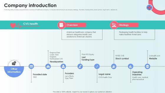 Following slide provides comprehensive overview of healthcare company. It includes elements such as company strategy, founders, headquarters, stock symbol, legal name, website etc. Slidegeeks is one of the best resources for PowerPoint templates. You can download easily and regulate Company Introduction Capital Raising Pitch Deck For Health Care Services Ppt Slide for your personal presentations from our wonderful collection. A few clicks is all it takes to discover and get the most relevant and appropriate templates. Use our Templates to add a unique zing and appeal to your presentation and meetings. All the slides are easy to edit and you can use them even for advertisement purposes. Following slide provides comprehensive overview of healthcare company. It includes elements such as company strategy, founders, headquarters, stock symbol, legal name, website etc.