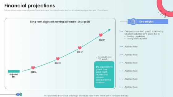 Following slide showcases company forecasted financial performance. It provides information about long term adjusted earning per share goals of financial years. Present like a pro with Financial Projections Capital Raising Pitch Deck For Health Care Services Ppt Presentation. Create beautiful presentations together with your team, using our easy-to-use presentation slides. Share your ideas in real-time and make changes on the fly by downloading our templates. So whether you are in the office, on the go, or in a remote location, you can stay in sync with your team and present your ideas with confidence. With Slidegeeks presentation got a whole lot easier. Grab these presentations today. Following slide showcases company forecasted financial performance. It provides information about long term adjusted earning per share goals of financial years.