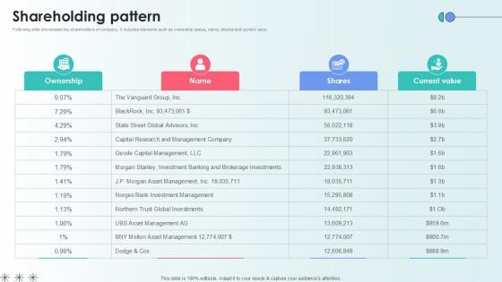 Following slide showcases top shareholders of company. It includes elements such as ownership status, name, shares and current value. This modern and well-arranged Shareholding Pattern Capital Raising Pitch Deck For Health Care Services Ppt Slide provides lots of creative possibilities. It is very simple to customize and edit with the Powerpoint Software. Just drag and drop your pictures into the shapes. All facets of this template can be edited with Powerpoint, no extra software is necessary. Add your own material, put your images in the places assigned for them, adjust the colors, and then you can show your slides to the world, with an animated slide included. Following slide showcases top shareholders of company. It includes elements such as ownership status, name, shares and current value.