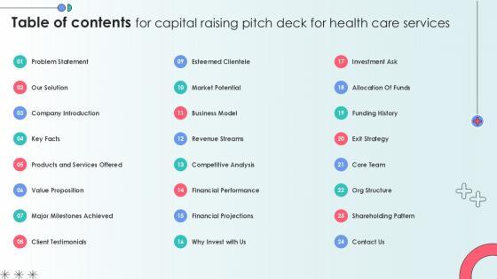 This Table Of Contents For Capital Raising Pitch Deck For Health Care Services Ppt Presentation is perfect for any presentation, be it in front of clients or colleagues. It is a versatile and stylish solution for organizing your meetings. The Table Of Contents For Capital Raising Pitch Deck For Health Care Services Ppt Presentation features a modern design for your presentation meetings. The adjustable and customizable slides provide unlimited possibilities for acing up your presentation. Slidegeeks has done all the homework before launching the product for you. So, do not wait, grab the presentation templates today Our Table Of Contents For Capital Raising Pitch Deck For Health Care Services Ppt Presentation are topically designed to provide an attractive backdrop to any subject. Use them to look like a presentation pro.