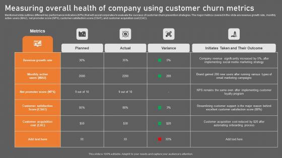 Mentioned slide outlines different key performance indicators KPIs that will assist corporates to evaluate the success of customer churn prevention strategies. The major metrics covered in the slide are revenue growth rate, monthly active users MAU, net promoter score NPS, customer satisfaction score CSAT, and customer acquisition cost CAC. Slidegeeks has constructed Implementing Strategies To Enhance Measuring Overall Health Of Company Using Customer Slides PDF after conducting extensive research and examination. These presentation templates are constantly being generated and modified based on user preferences and critiques from editors. Here, you will find the most attractive templates for a range of purposes while taking into account ratings and remarks from users regarding the content. This is an excellent jumping-off point to explore our content and will give new users an insight into our top-notch PowerPoint Templates. Mentioned slide outlines different key performance indicators KPIs that will assist corporates to evaluate the success of customer churn prevention strategies. The major metrics covered in the slide are revenue growth rate, monthly active users MAU, net promoter score NPS, customer satisfaction score CSAT, and customer acquisition cost CAC.