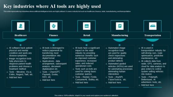 This slide represents top industries where artificial intelligence tools are highly utilized. It covers industry list such as healthcare, finance, retail, manufacturing, and transportation. Do you have to make sure that everyone on your team knows about any specific topic I yes, then you should give Key Industries Where AI Tools Are Highly Used Applications And Impact Themes Pdf a try. Our experts have put a lot of knowledge and effort into creating this impeccable Key Industries Where AI Tools Are Highly Used Applications And Impact Themes Pdf. You can use this template for your upcoming presentations, as the slides are perfect to represent even the tiniest detail. You can download these templates from the Slidegeeks website and these are easy to edit. So grab these today This slide represents top industries where artificial intelligence tools are highly utilized. It covers industry list such as healthcare, finance, retail, manufacturing, and transportation.