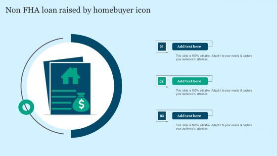Showcasing this set of slides titled Non FHA Loan Raised By Homebuyer Icon Graphics Pdf. The topics addressed in these templates are Non FHA, Loan Raised, Homebuyer. All the content presented in this PPT design is completely editable. Download it and make adjustments in color, background, font etc. as per your unique business setting. Our Non FHA Loan Raised By Homebuyer Icon Graphics Pdf are topically designed to provide an attractive backdrop to any subject. Use them to look like a presentation pro.