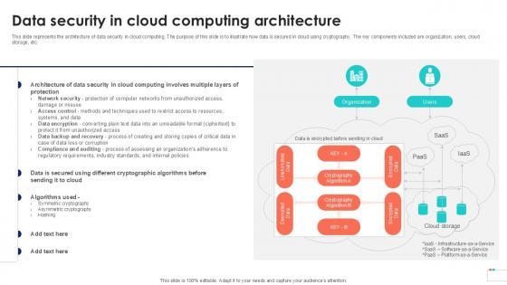 This slide represents the architecture of data security in cloud computing. The purpose of this slide is to illustrate how data is secured in cloud using cryptography. The key components included are organization, users, cloud storage, etc. This modern and well-arranged Data Security In Cloud Computing Data Security In Cloud Computing Ppt Example provides lots of creative possibilities. It is very simple to customize and edit with the Powerpoint Software. Just drag and drop your pictures into the shapes. All facets of this template can be edited with Powerpoint, no extra software is necessary. Add your own material, put your images in the places assigned for them, adjust the colors, and then you can show your slides to the world, with an animated slide included. This slide represents the architecture of data security in cloud computing. The purpose of this slide is to illustrate how data is secured in cloud using cryptography. The key components included are organization, users, cloud storage, etc.
