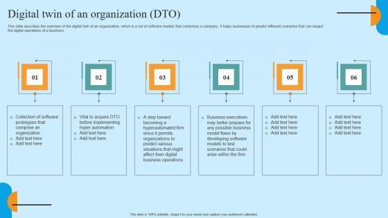 This slide describes the overview of the digital twin of an organization, which is a set of software models that comprises a company. It helps businesses to predict different scenarios that can impact the digital operations of a business. Crafting an eye-catching presentation has never been more straightforward. Let your presentation shine with this tasteful yet straightforward Digital Twin Of An Organization Dto Hyper Automation Solutions Mockup Pdf template. It offers a minimalistic and classy look that is great for making a statement. The colors have been employed intelligently to add a bit of playfulness while still remaining professional. Construct the ideal Digital Twin Of An Organization Dto Hyper Automation Solutions Mockup Pdf that effortlessly grabs the attention of your audience Begin now and be certain to wow your customers This slide describes the overview of the digital twin of an organization, which is a set of software models that comprises a company. It helps businesses to predict different scenarios that can impact the digital operations of a business.