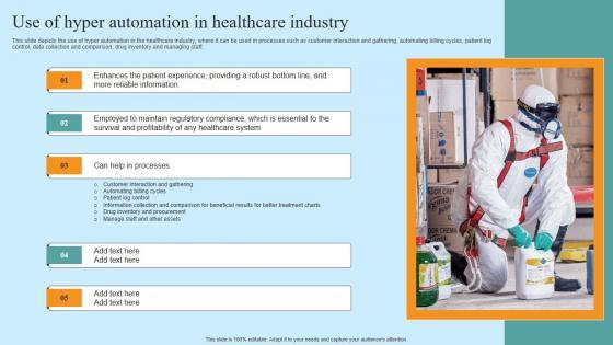 This slide depicts the use of hyper automation in the healthcare industry, where it can be used in processes such as customer interaction and gathering, automating billing cycles, patient log control, data collection and comparison, drug inventory and managing staff. Do you have to make sure that everyone on your team knows about any specific topic I yes, then you should give Use Of Hyper Automation In Healthcare Industry Hyper Automation Solutions Diagrams PDF a try. Our experts have put a lot of knowledge and effort into creating this impeccable Use Of Hyper Automation In Healthcare Industry Hyper Automation Solutions Diagrams PDF. You can use this template for your upcoming presentations, as the slides are perfect to represent even the tiniest detail. You can download these templates from the Slidegeeks website and these are easy to edit. So grab these today This slide depicts the use of hyper automation in the healthcare industry, where it can be used in processes such as customer interaction and gathering, automating billing cycles, patient log control, data collection and comparison, drug inventory and managing staff.