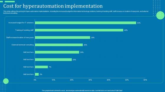 This slide outlines the pricing for hyper-automation implementation, including the increased budget for information technology solutions, training of existing staff, staff increase or creation of new posts, and external technical consulting. If you are looking for a format to display your unique thoughts, then the professionally designed Role Of Hyperautomation In Redefining Business Cost For Hyper Automation Implementation Sample PDF is the one for you. You can use it as a Google Slides template or a PowerPoint template. Incorporate impressive visuals, symbols, images, and other charts. Modify or reorganize the text boxes as you desire. Experiment with shade schemes and font pairings. Alter, share or cooperate with other people on your work. Download Role Of Hyperautomation In Redefining Business Cost For Hyper Automation Implementation Sample PDF and find out how to give a successful presentation. Present a perfect display to your team and make your presentation unforgettable.